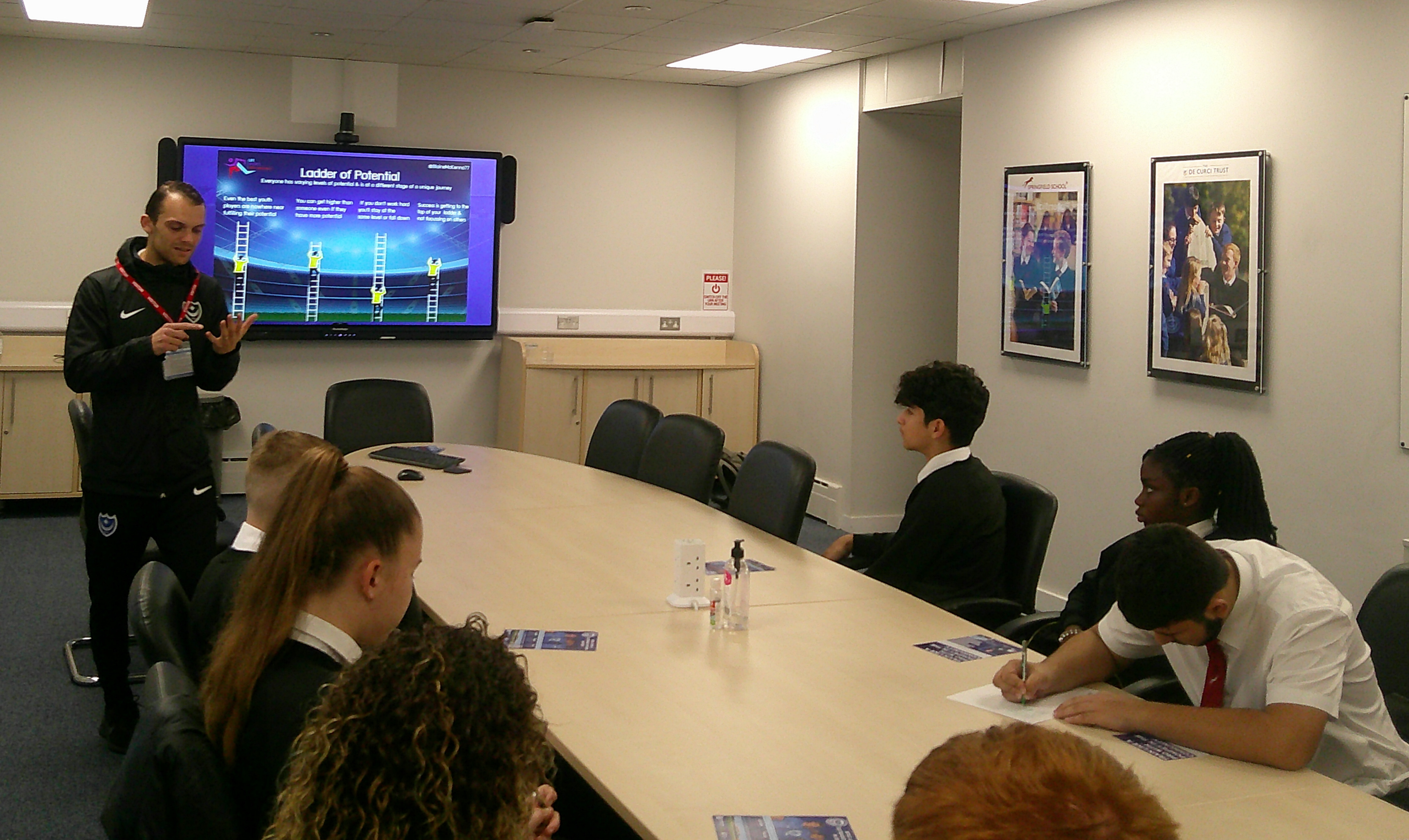 On 03 October, students in Years 10 and 11 had a chance to find out more about a career in football from Pompey in the Community, the social arm of Portsmouth FC. Alex Burt informed the group that The UK Sports industry and connected activity contributes £99.6 billion to the UK economy and employs about 1.25 million people. We looked at the salary scale of footballers in different leagues but also explored careers in the industry other than playing, such as in physiotherapy, film and camerawork, psychology, logistics and hospitality.