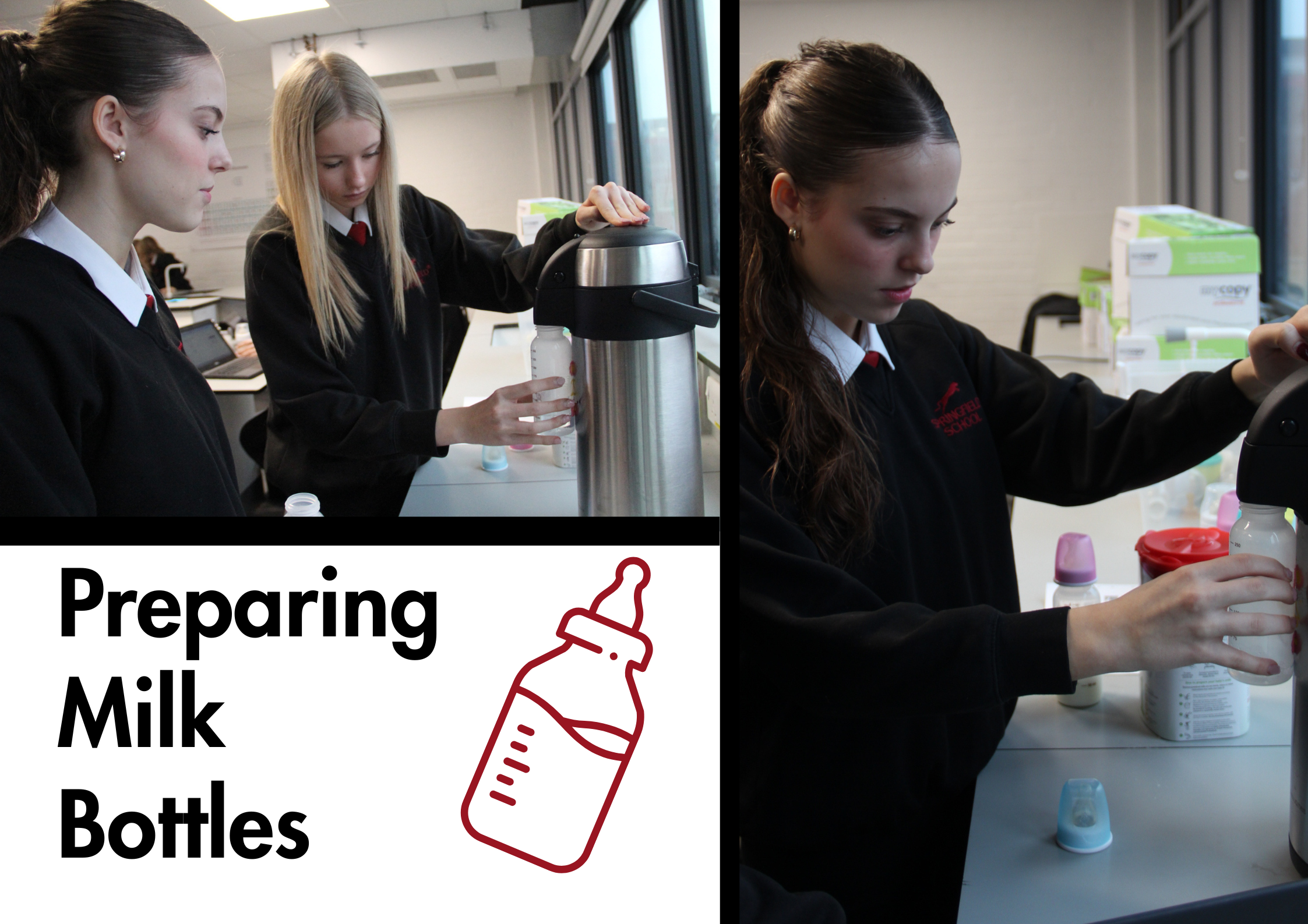 Mrs Mandrill's Year 10 Child Development class have been learning how to make up a bottle of formula milk as part of their coursework. All the pupils managed to successfully make a 2 fluid ounce bottle, having carefully measured the hot water and made sure that the scoop of powder was level. This is an important part of the course as it allows students to appreciate the importance of hygiene, correct measurements, and equipment cleanliness, promoting broader health and safety awareness. This provides foundational knowledge for careers in healthcare, childcare or even nutrition.