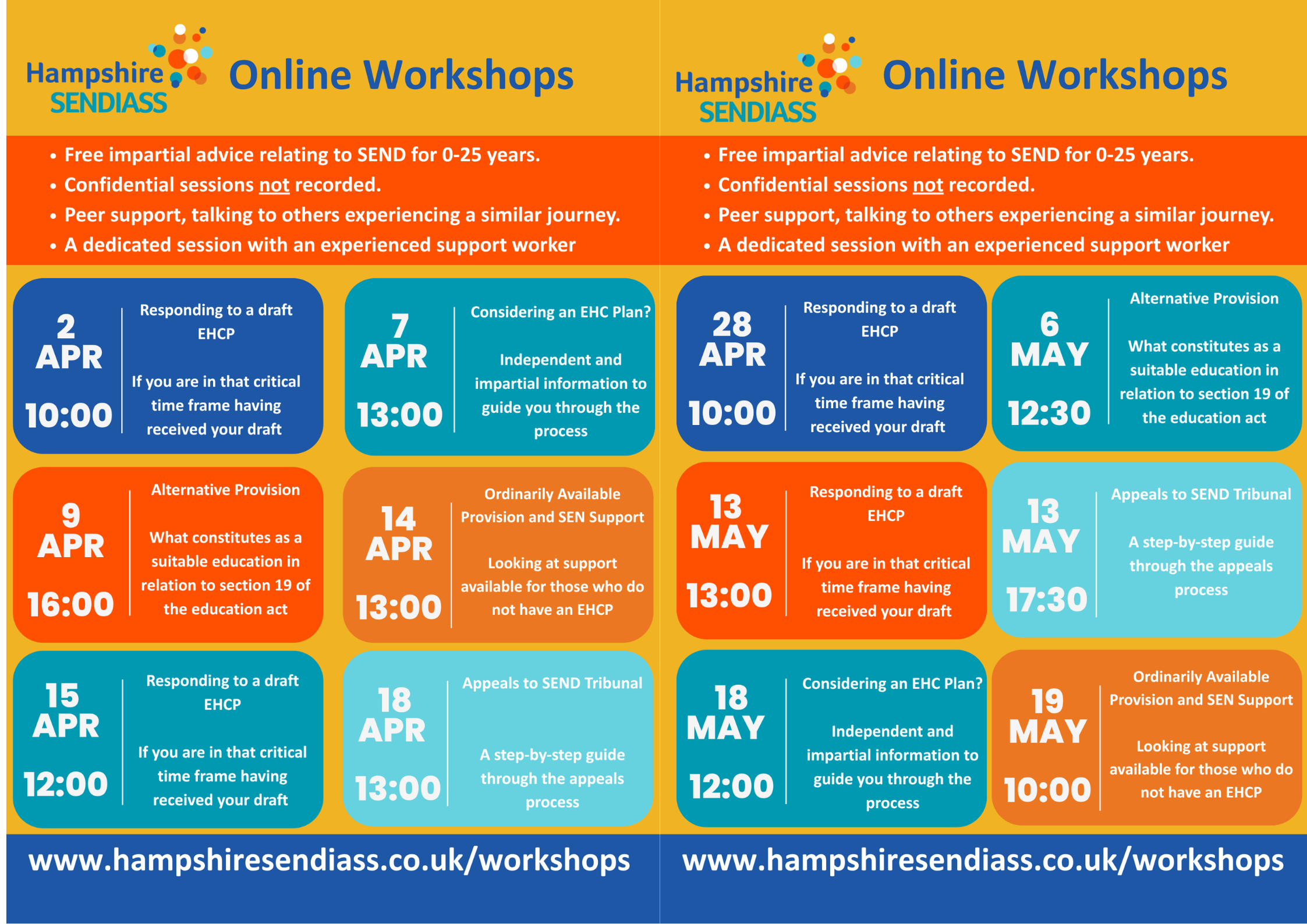 We are pleased to share below details of parent/carer SEND workshops provided by Hampshire SENDIASS.